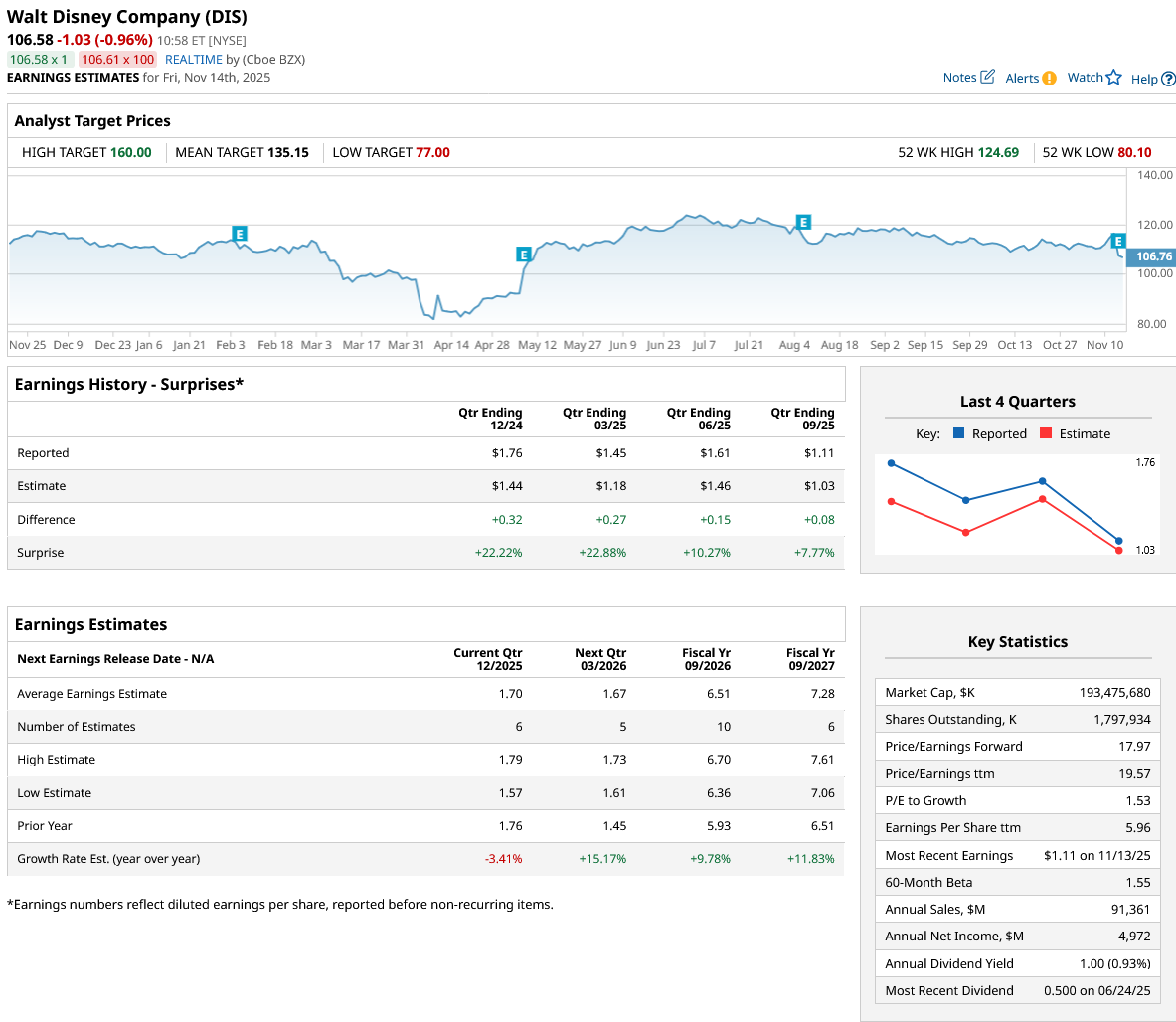 Meanwhile, while Disney has guided for double-digit earnings growth in fiscal year 2026, it would be a back-heavy year for the company as it still faces tough comps in the fiscal first quarter.