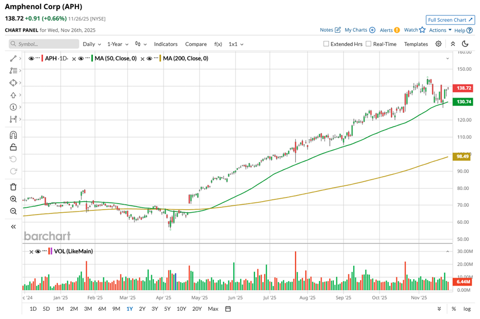 Fundamental performance has reinforced the trend. Shares pushed higher on Oct. 22, first rising 3.6% intraday, then adding another 5% the next day, after Amphenol delivered a strong Q3 2025 earnings report.