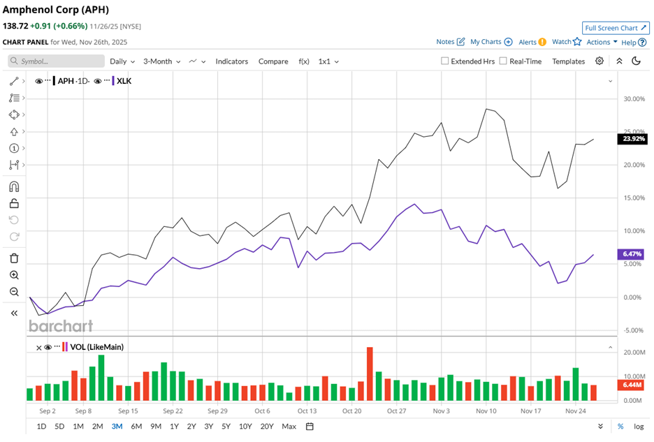 APH stock is currently trading roughly 3.9% below its November high of $144.37, yet the recent trend remains distinctly favorable. The stock has rallied nearly 26.2% over the past three months, far outstripping the Technology Select Sector SPDR Fund (XLK), which gained only 7.9% over the same period.