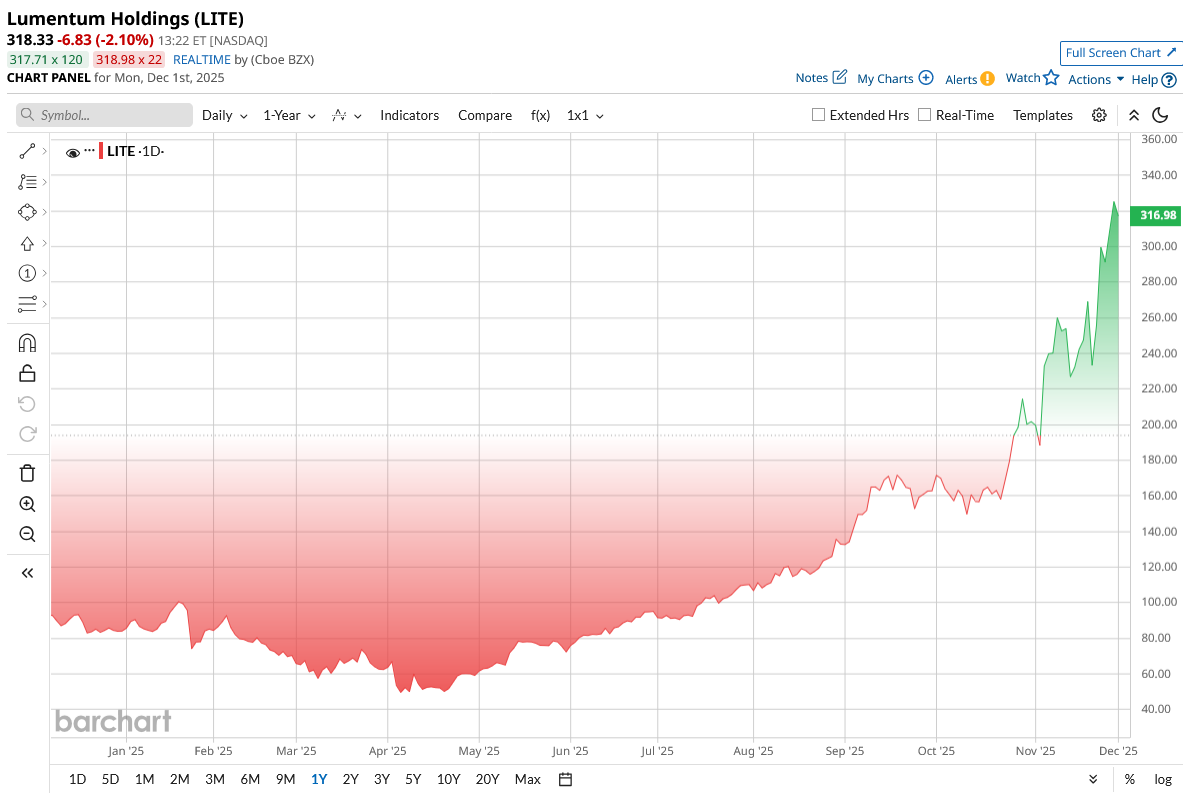 LITE shares have soared this year. As of the start of December, LITE stock is up roughly 279% year to date (YTD). This meteoric rise is driven by booming demand. Big cloud companies are buying lasers and optical switches as fast as they can. Strong earnings and a stream of higher price targets have fueled the rally.
