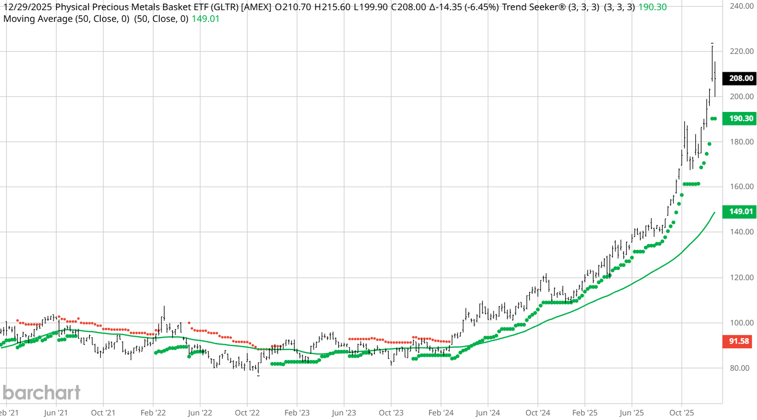 The goal for the GLTR ETF is for the shares to reflect the performance of the price of a basket of gold, silver, platinum, and palladium bullion, less the expenses of the trust’s operations. Its total return over the last five years is a whopping 115.29%