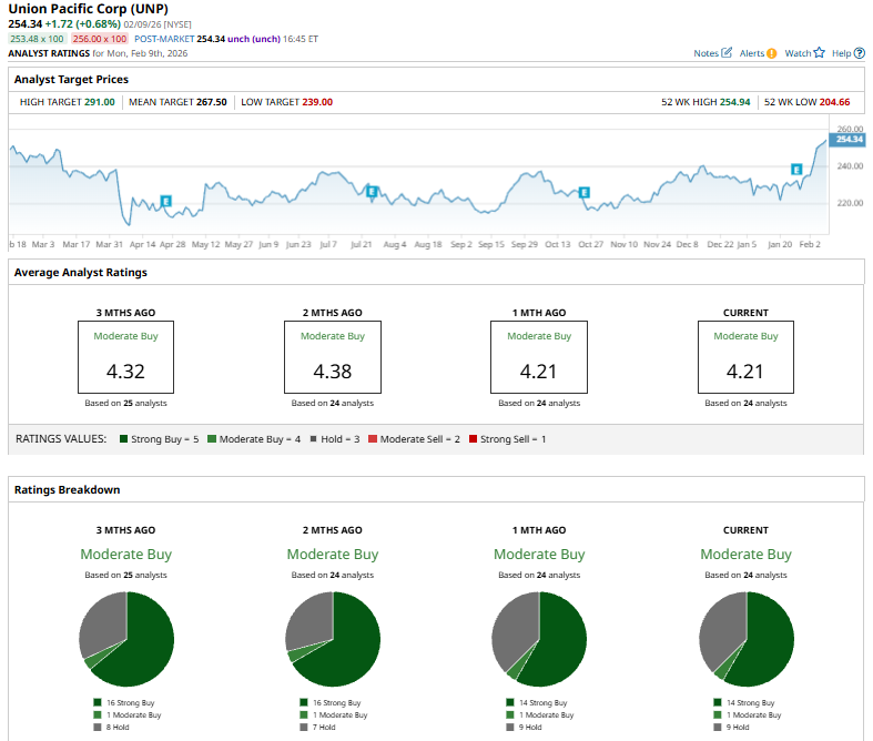 On Jan. 29, Brian Ossenbeck of JPMorgan Chase & Co. (JPM) reiterated a “Neutral” rating on Union Pacific while trimming his price target to $265 from $270, reflecting a more cautious near-term outlook on the stock.