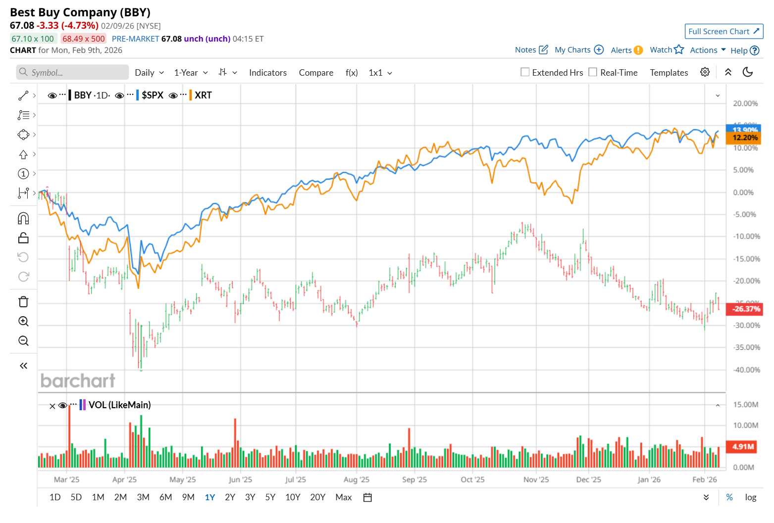 Narrowing the focus, BBY has also lagged the State Street SPDR S&P Retail ETF (XRT), which surged 13.8% over the past 52 weeks and 4.4% on a YTD basis.