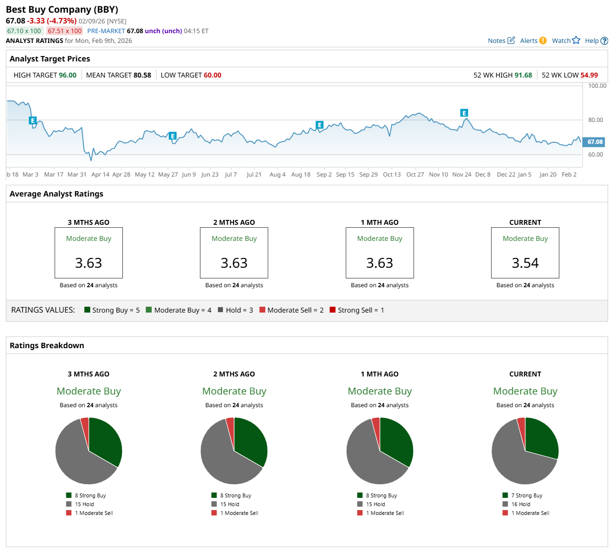 On Feb. 3, Evercore Inc. (EVR) maintained an "In Line" rating on BBY but lowered its price target to $70, indicating a 4.4% potential upside from the current levels.