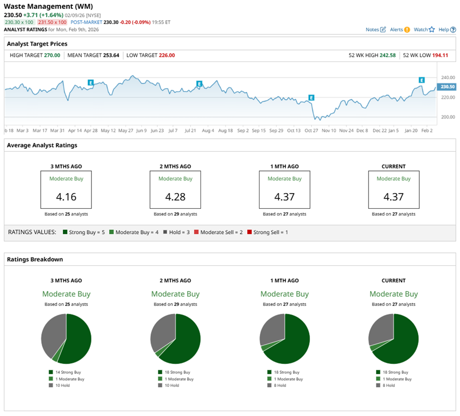 Wall Street continues to support WM stock, assigning it a “Moderate Buy” consensus rating. Among 27 analysts, 18 have issued a “Strong Buy” recommendation, one assigns a “Moderate Buy,” and eight maintain “Hold” ratings.