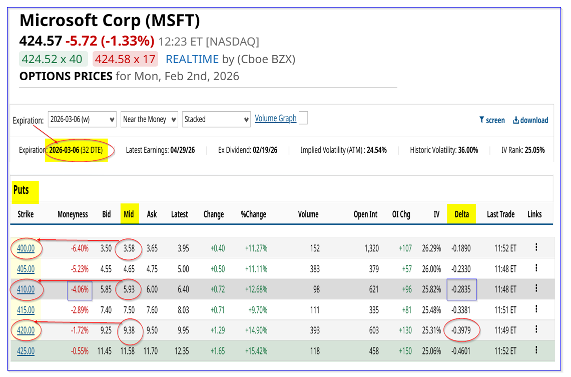For example, look at the March 6, 2026, option expiration period, 32 days to expiry (DTE). It shows that the $410.00 put option exercise (i.e., strike) price contract has a midpoint premium of $5.93.
