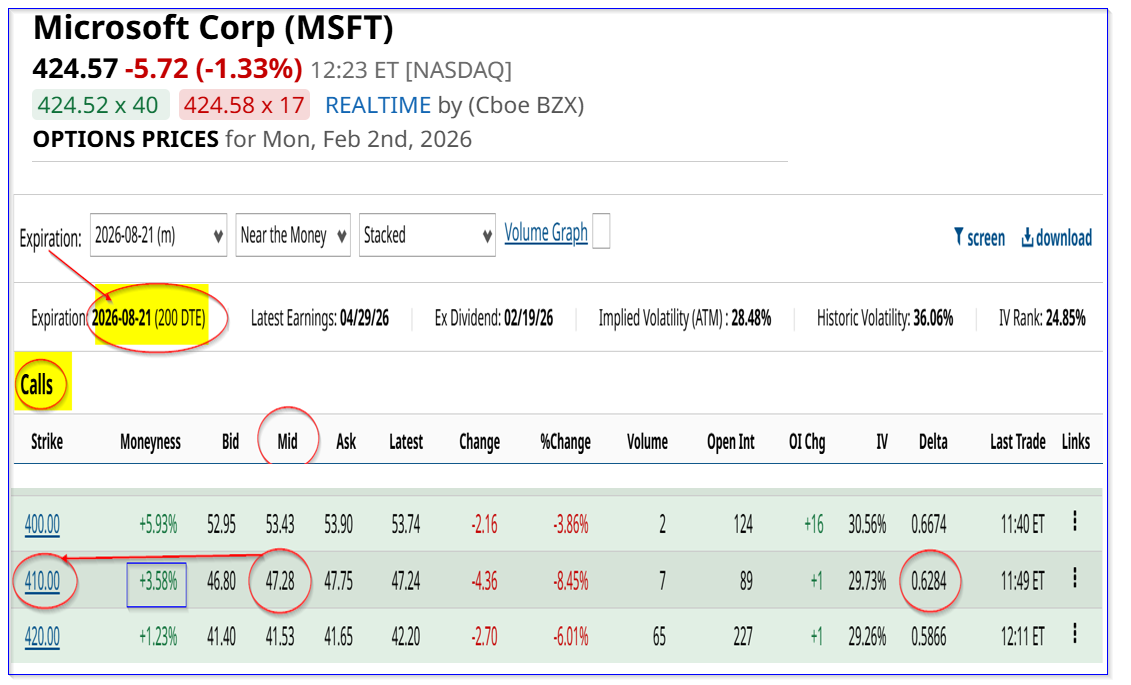 They could also buy ITM call options in longer-dated periods using some of this short-put income. For example, look at the Aug. 21, 2026, expiry period. It shows that the $410.00 call option expiring in 200 days (about six months) has a midpoint premium of $47.28.