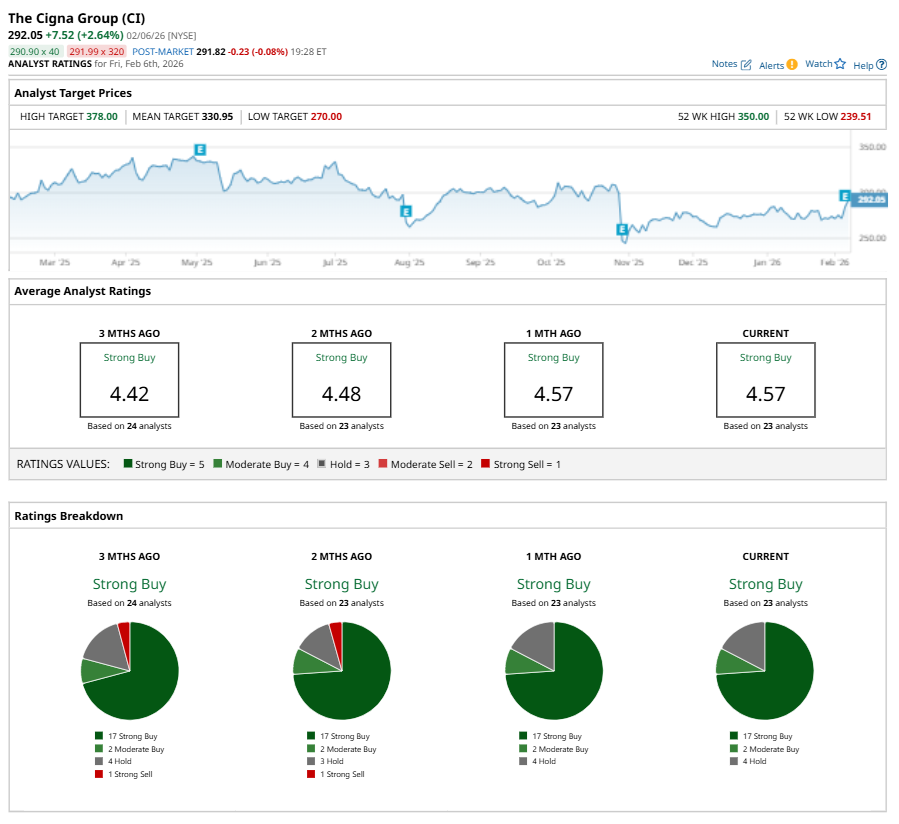 On Feb. 5, RBC Capital analyst Ben Hendrix maintained a “Buy” rating on CI and set a price target of $333, implying a potential upside of 12.9% from current levels.