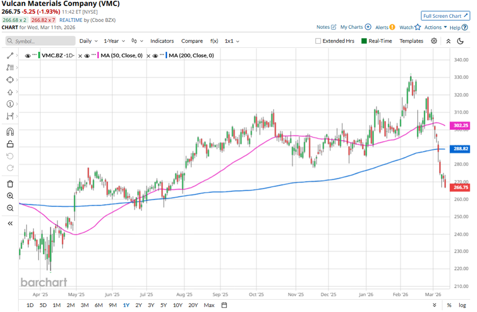 Shares of Vulcan Materials fell 7.8% on Feb. 17 after the company reported Q4 2025 earnings below expectations, with adjusted EPS of $1.70 and net earnings declining to $252 million despite revenue rising to $1.91 billion. Investors were also concerned about margin pressure, as Q4 adjusted EBITDA dropped to $518 million and EBITDA margin fell to 27.1%, while aggregate gross profit per ton declined to $7.91.