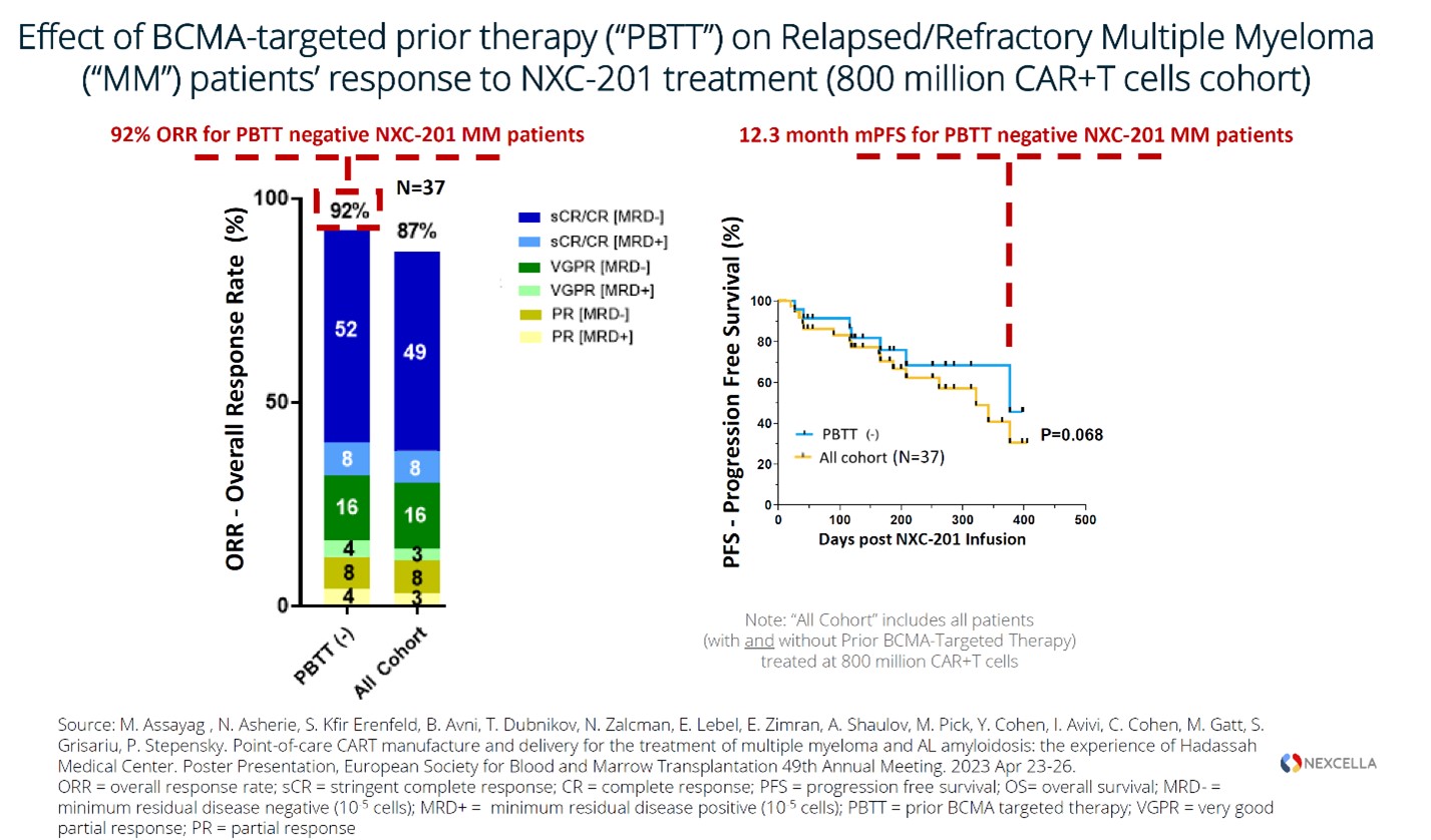 - 92% was the overall response rate produced by NXC-201 in relapsed/refractory multiple myeloma patients treated at the therapeutic dose of 800 million CAR+T cells in its ongoing phase 1b/2a NEXICART-1 clinical trial (NCT04720313) who were not exposed to prior BCMA-targeted therapy, producing a median progression free survival (mPFS) of 12.3 months as of the February 9, 2023 data cutoff