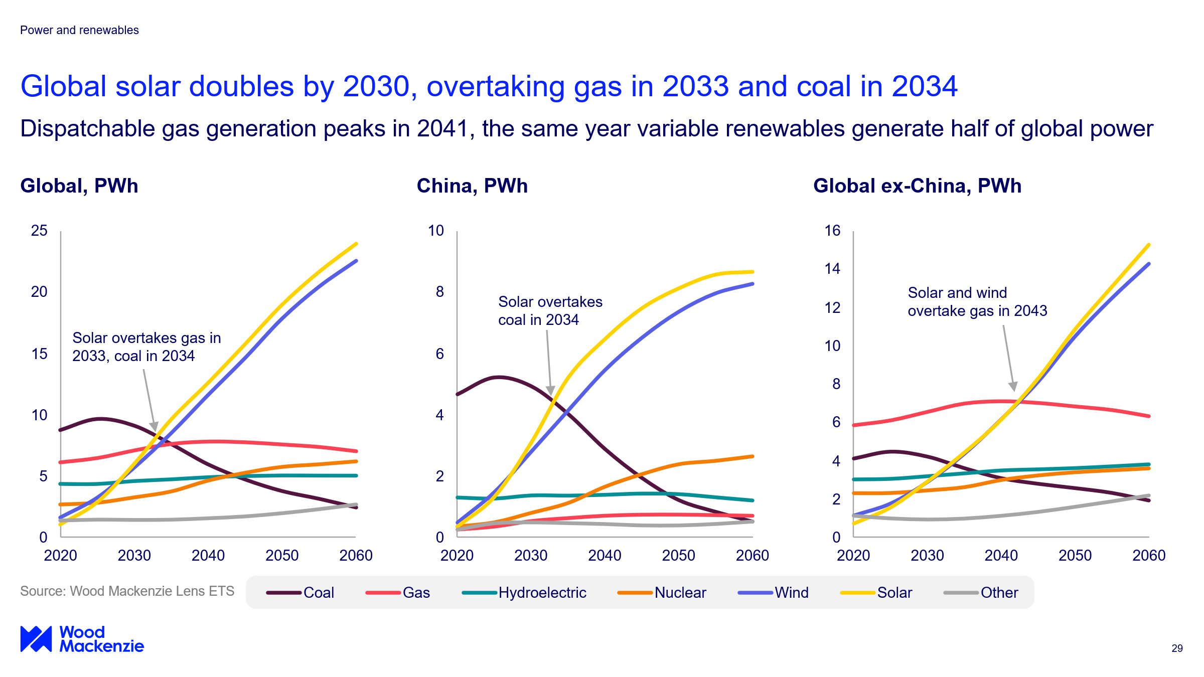 - Variable renewables will surge from 20% of generation today to 60% by 2050, with solar alone doubling by 2030 and overtaking gas in 2033 and coal in 2034. Battery storage and nuclear provide flexibility to renewable-heavy grids.