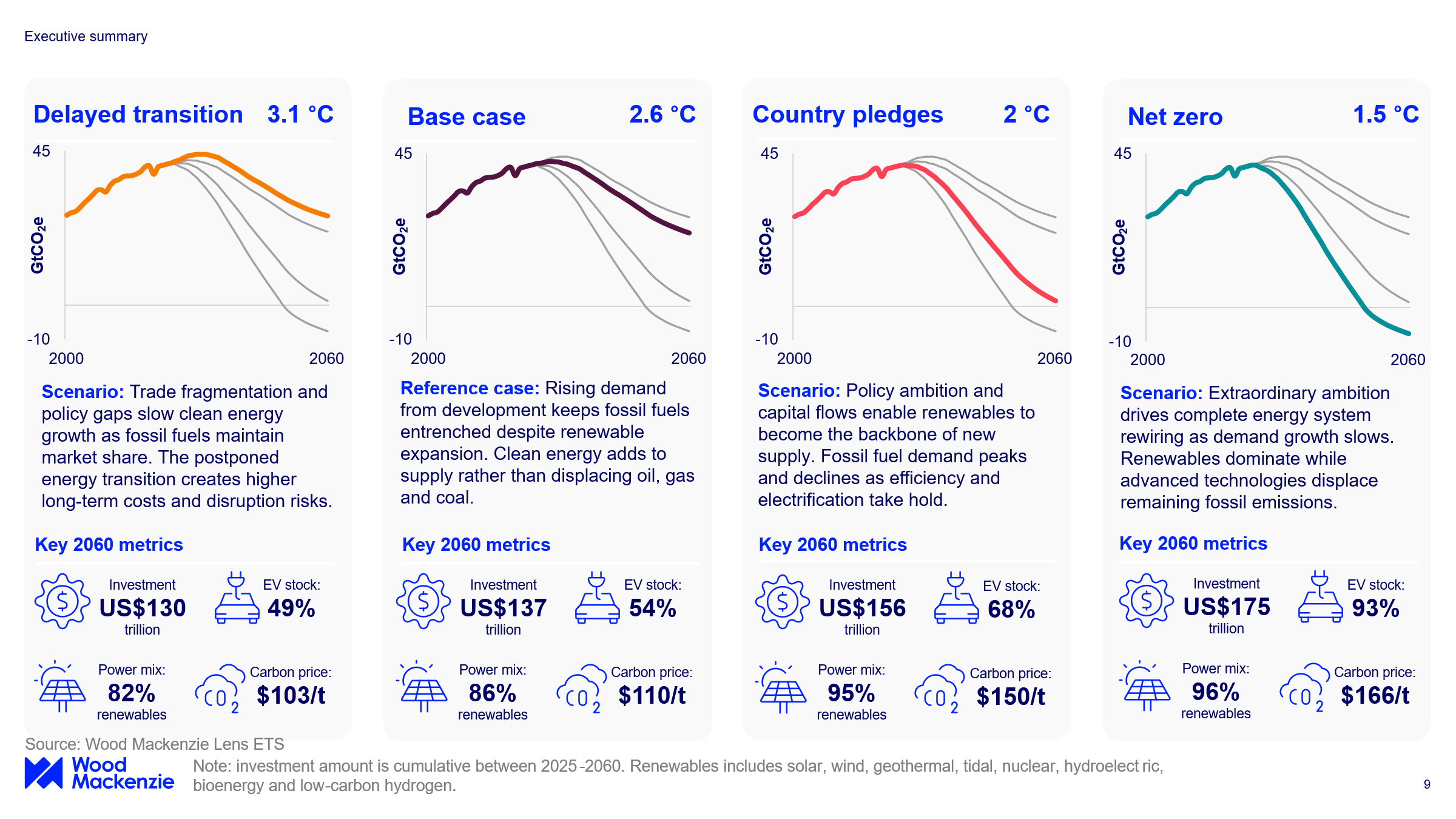 Wood Mackenzie’s Energy Transition Outlook report (part of our Lens Energy Transition Scenarios) maps four distinct energy transition pathways with increasing levels of ambition, including the role of emerging technologies and investment opportunities. They are our independent assessment of what it would take to deliver on countries’ announced net zero pledges and potential outcomes for the planet.
