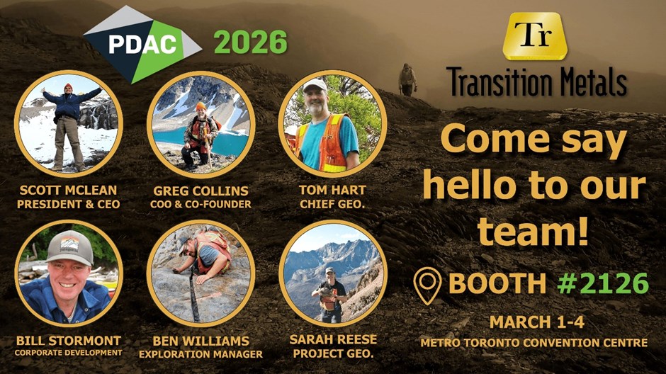 Transition President & CEO Scott McLean commented: "PDAC is an important venue for building relationships and advancing business development initiatives. We are always interested in connecting with groups looking for high-quality Canadian exploration opportunities, and to discuss partnership structures that can advance projects while preserving shareholder leverage. We look forward to renewing our existing industry partnerships and developing new ones during PDAC."